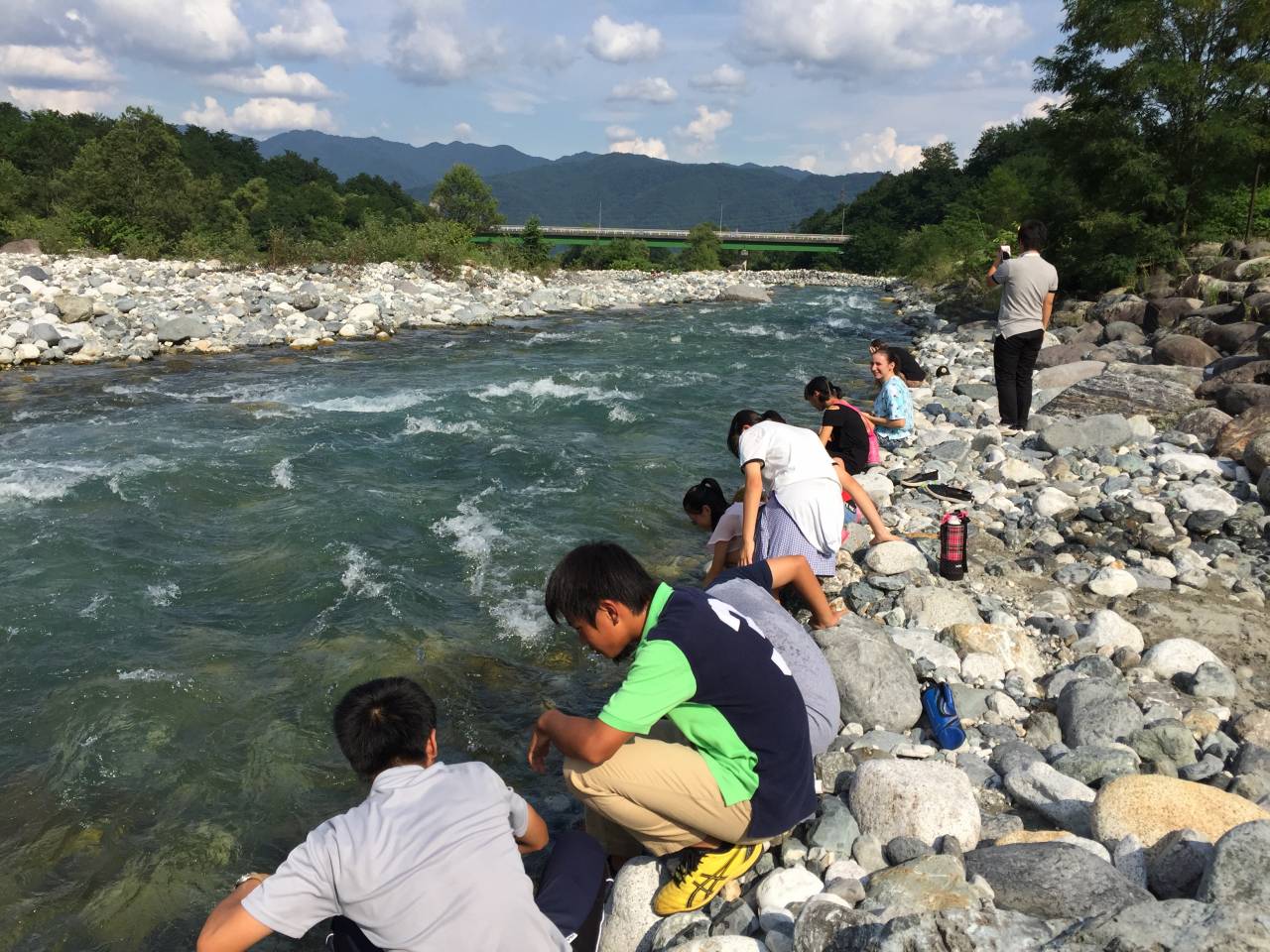 ロッジ前でゲームしてましたが、天気も良いので徒歩10分位にある松川に行きました。とても気持ちの良い所です。川の水はとても綺麗で冷たかったです。足だけ水に浸かり川の水で顔を洗っている子もいました。気温は30度もあり暑いです。1時間程遊びロッジに戻りました。戻ってからトランプやUNOを英語でしたりロッジ前で、だるまさんがころんだをしたり。