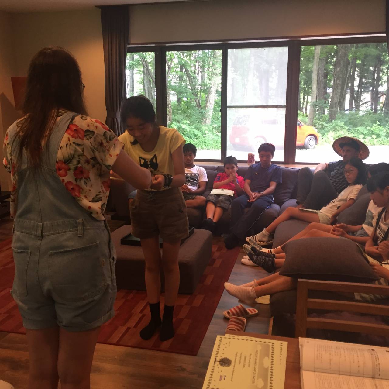 あっという間の3日間でした。まもなくキャンプが終わろうとしています。ショッピングから帰ってきたら、また映画鑑賞をしました。もちろん英語で見ます。出来るだけ多く英語を聞くとよいですね。これからも英語に触れて下さいね。イングリッシュキャンプ修了証を1人1人、クリスティンから貰いました。よく頑張りました!