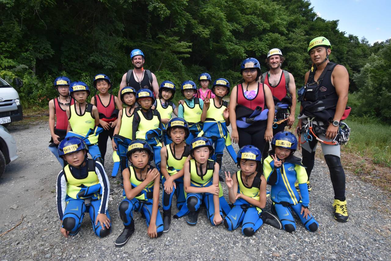 お昼ご飯を食べたら本日のメインイベント、急流沢登りです。予定ではラフティングだったのですが、ここ数日の異常な暑さと雨でラフティングをする川の流れが急になったこと、そしてなぜか「あぶ」が大量発生、安全面と刺される心配から別の渓流での沢登りにプログラムを変更しました。