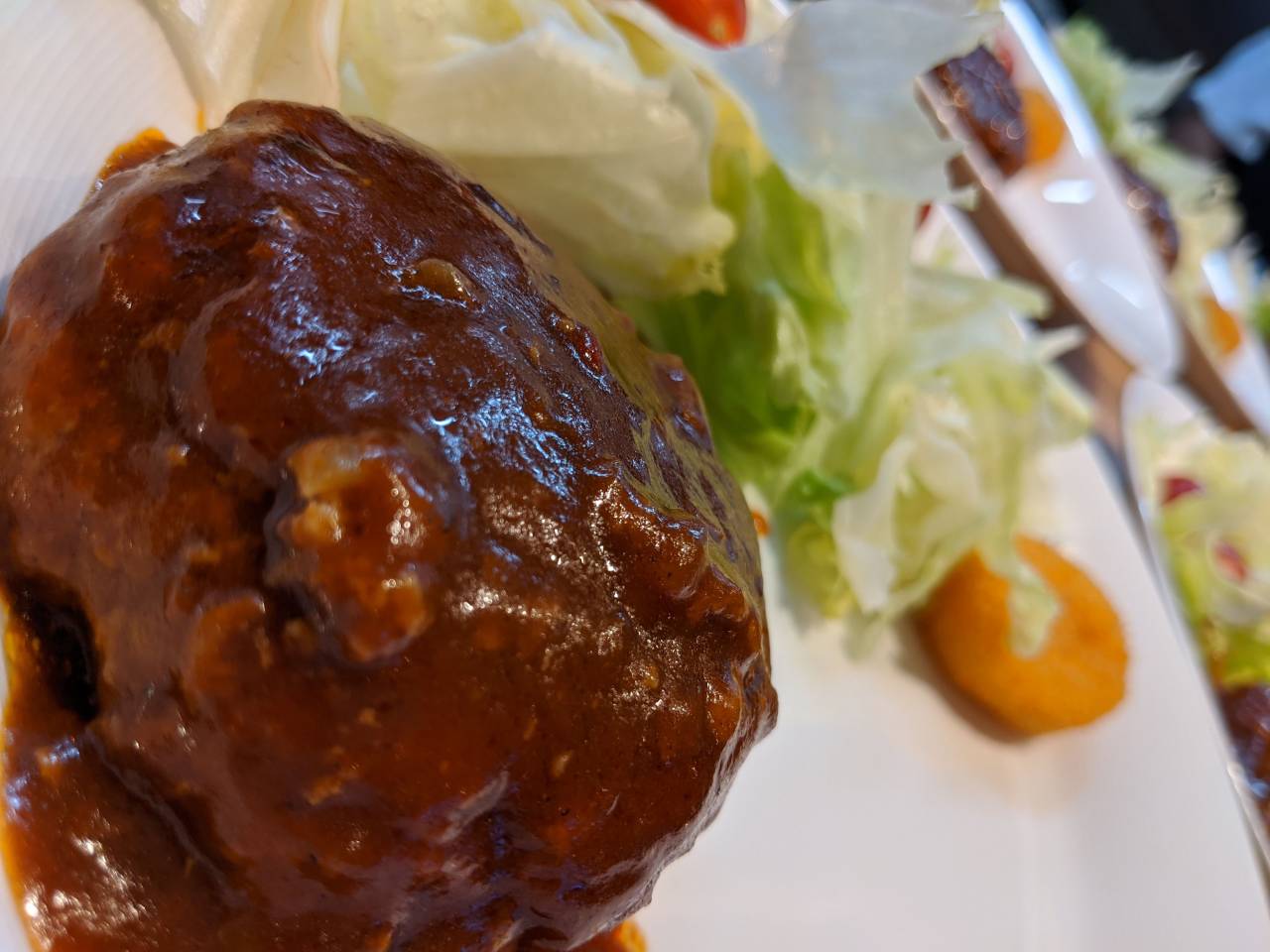 スープとハンバーグ、サラダ、ポテト、タコなど。