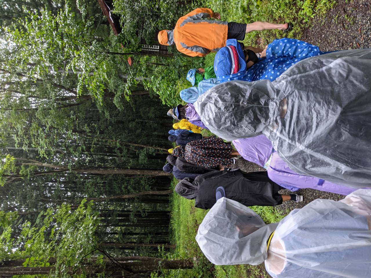 散歩では雨具を着用し、自然の中を歩きながら英語名を教えてもらいました。