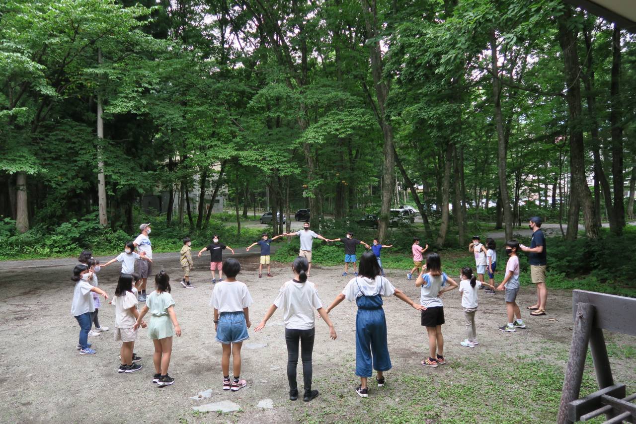 まずは森に囲まれたロッジの外に出て、体を使ってアイスブレイキングのアクティビティー。