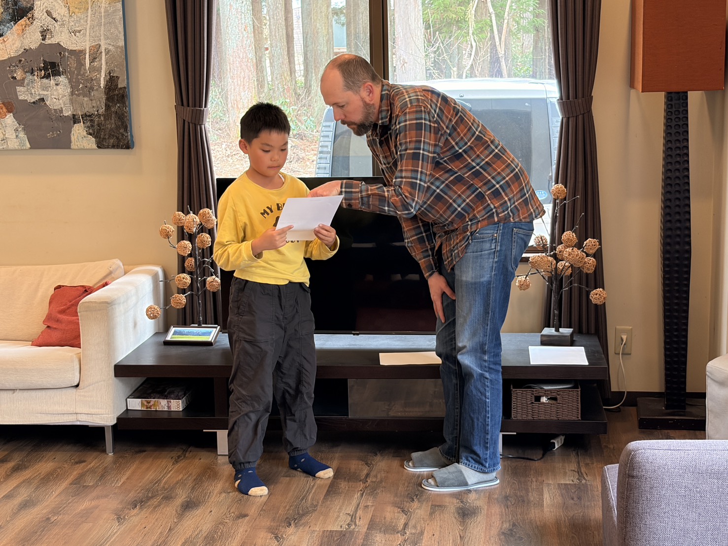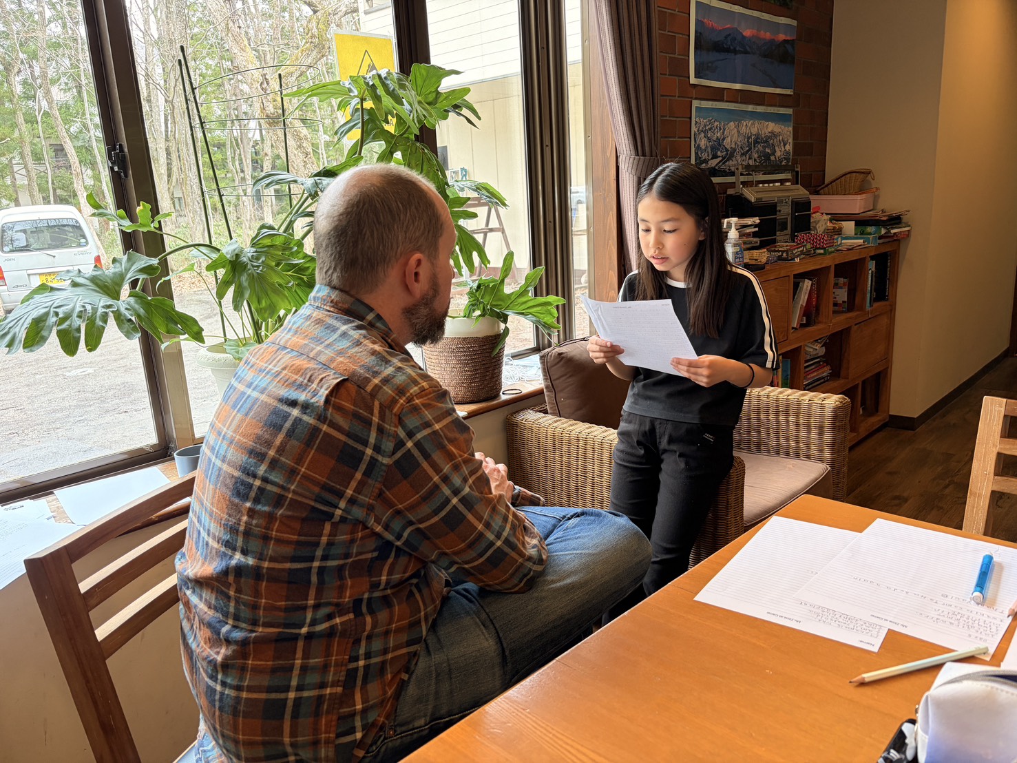 1日目から今日までの日ごとに分けていた日記を言葉を足して文章を完成させて、スピーチをする時に使う紙に清書をして、最後に本番のようにジョナとマイクに見てもらったら終わり。